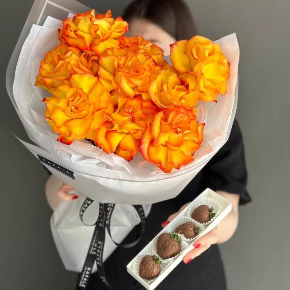 Клубника в шоколаде – 4 шт. Роза Голландская – 9 шт.