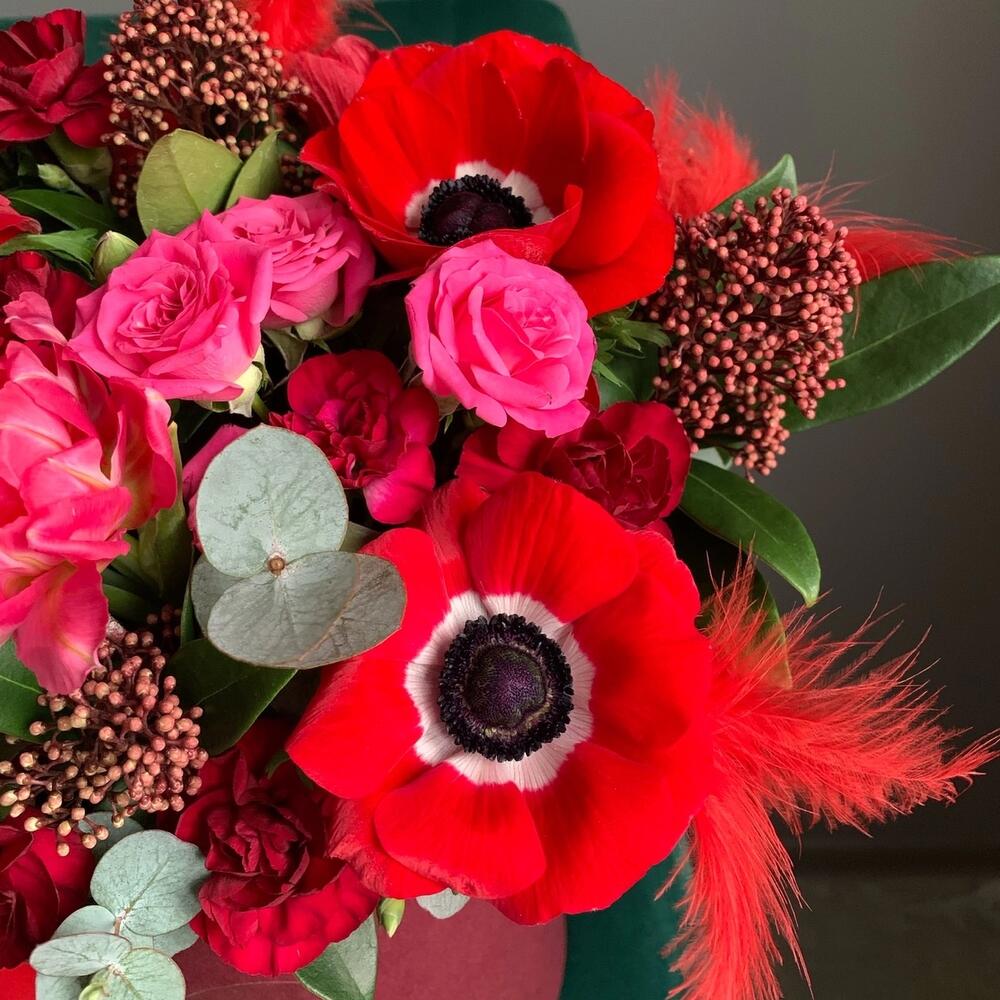 Анемон красный – 4 шт.Роза кустовая – 3 шт.Скиммия – 3 шт.Диантус кустовой – 4 шт.Тюльпан – 3 шт.Эвкалипт – 2 шт.Шляпная коробка – 1 шт.перья декор – 4 шт.