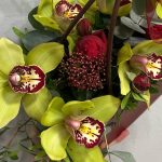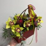 Писташ – 3 шт. Эвкалипт – 3 шт. Лента атласная – 1 шт. Скиммия – 3 шт. ЦИМБИДИУМ – 7 шт. Сумочка – 1 шт. Лента органза – 1 шт. биофлор – 1 шт. роза ред пиана пионовидная – 2 шт.