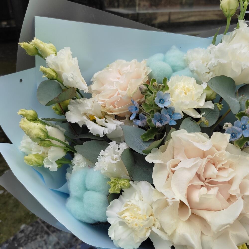Роза пионовидная – 2 шт.Диантус – 3 шт.Лизиантус – 2 шт.Хлопок – 3 шт.Оксипеталум – 2 шт.Упаковка – 2 шт.Лента – 2 шт.