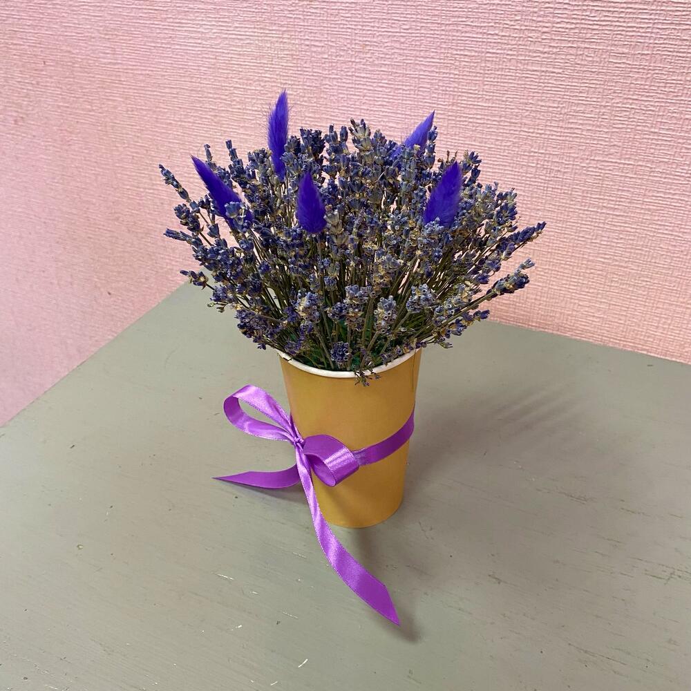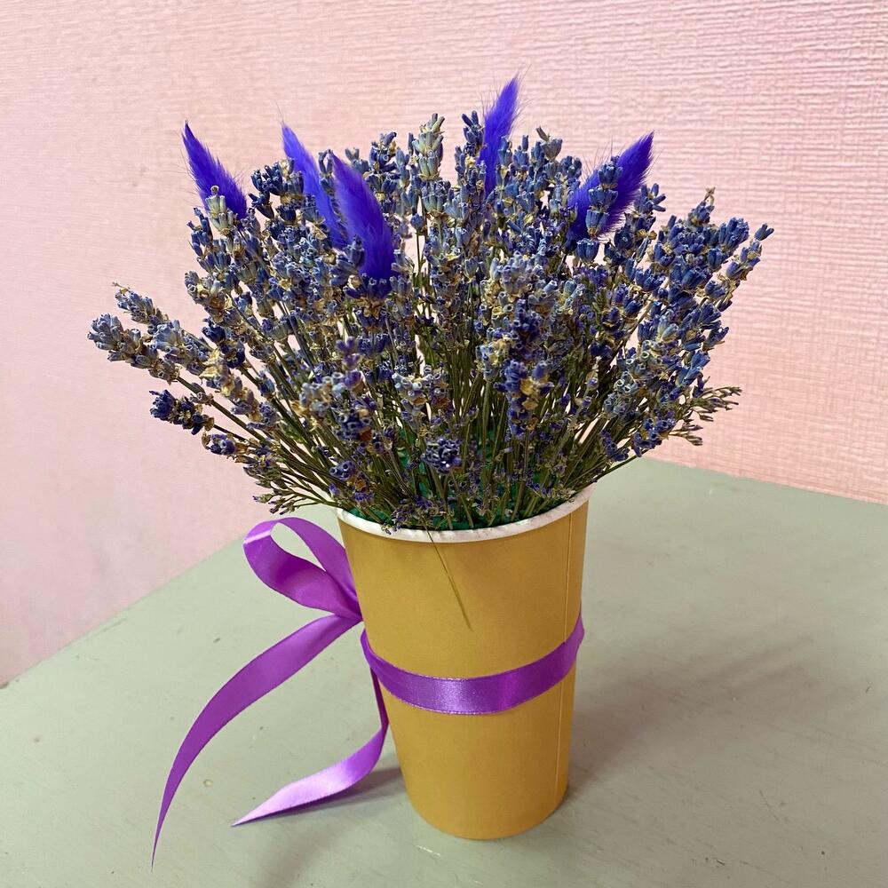 Лаванда (сухоцвет) – 50 шт.Лимониум – 1 шт.Лагурус (сухоцвет) – 5 шт.Стакан флористический – 1 шт.