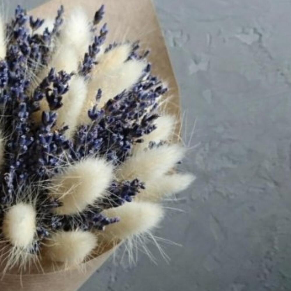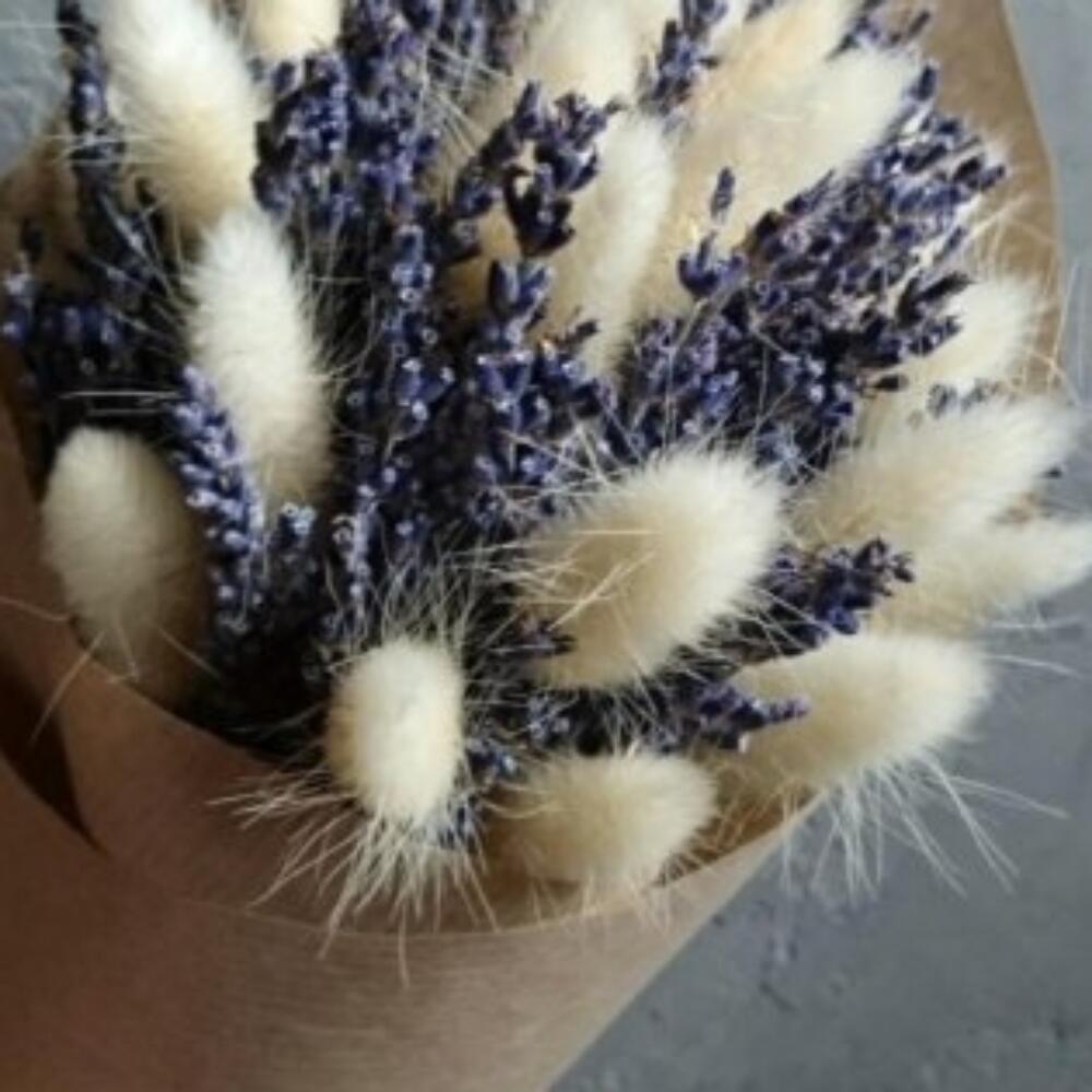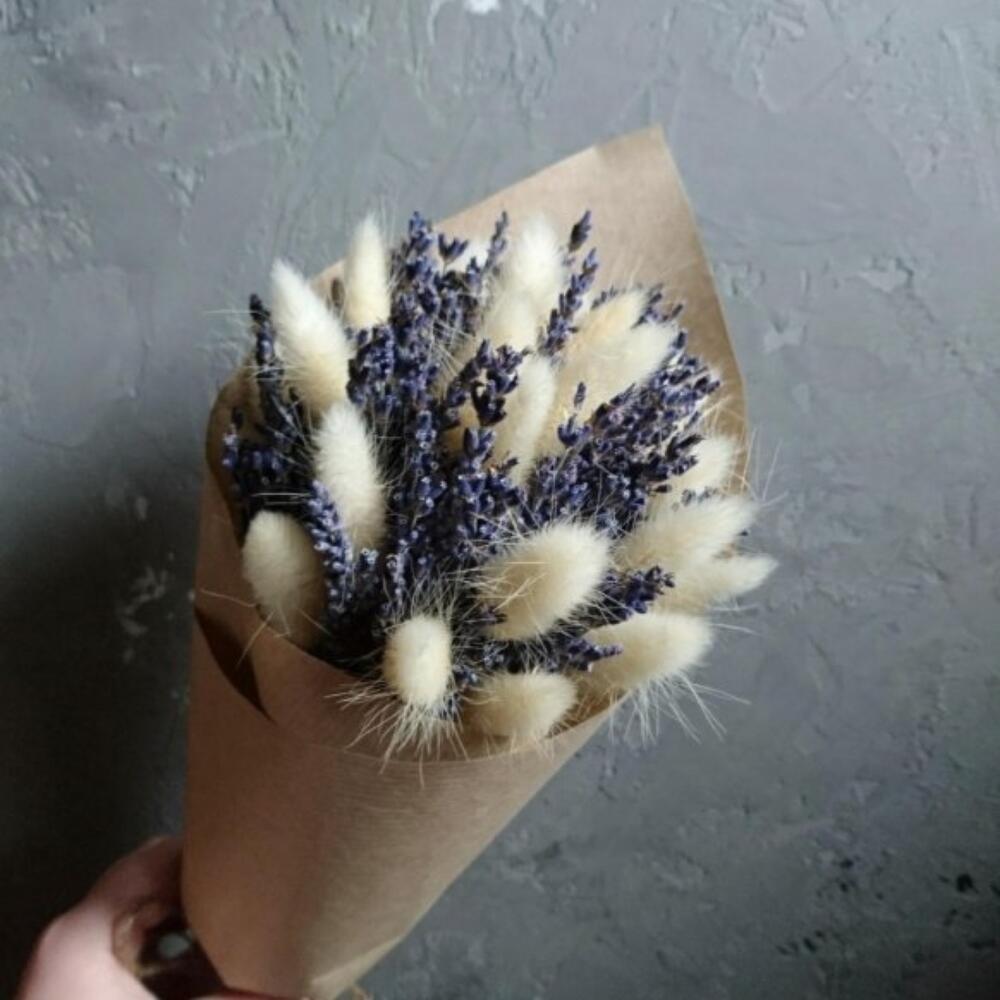 Лаванда (сухоцвет) – 55 шт.Лагурус (сухоцвет) – 15 шт.Крафт упаковка – 1 шт.бечевка натуральная – 1 шт.