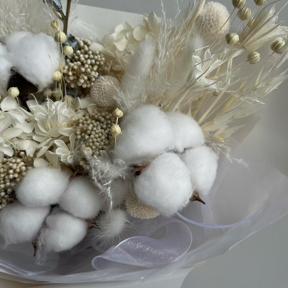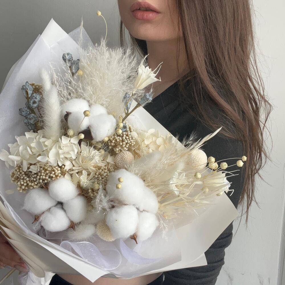 Упаковка дизайнерская – 1 шт.Хлопок – 3 шт.Гортензия – 1 шт.Краспедия – 3 шт.Лагурус – 7 шт.Лен – 1 шт.Нигелла – 1 шт.Озотамнус – 1 шт.пампасная трава – 1 шт.эвкалипт боул с плодами – 1 шт.