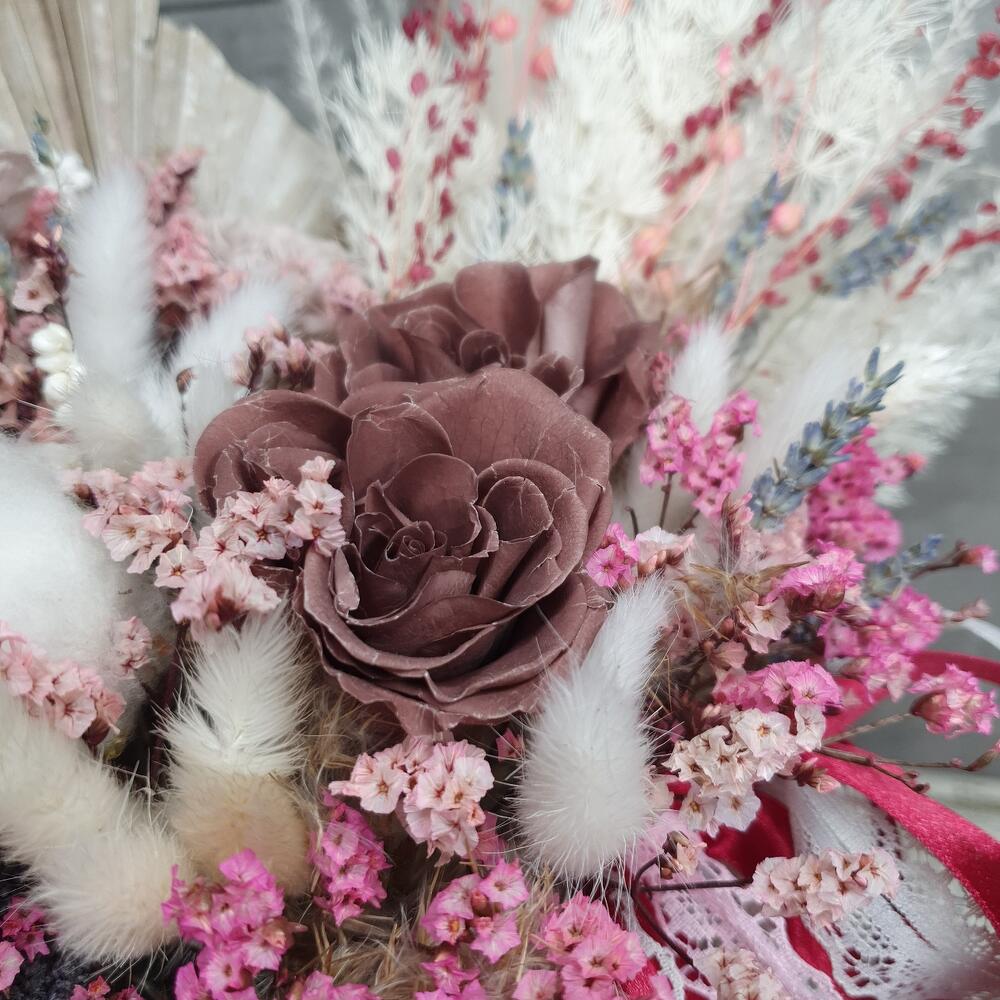 стабилизированные розы – 5 шт.аурея белая – 2 шт.Хлопок натуральный – 1 шт.Лагурус – 16 шт.лен сухоцвет – 3 шт.бриза пучок – 2 шт.копье пальмы – 1 шт.амарант стабилизированный – 5 шт.статица стабилизированная – 9 шт.рускус стабилизированный выбеленный – 1 шт.сорго – 3 шт.лавандин пучок – 1 шт.аспарагус стабилизированный выбеленный – 1 шт.Шляпная коробка – 1 шт.Лента – 2 шт.Тишью – 1 шт.