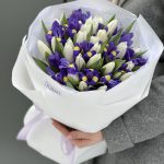 Тюльпан белый – 31 шт. ирисы – 15 шт. Писташ – 5 шт. Оформление – 1 шт.