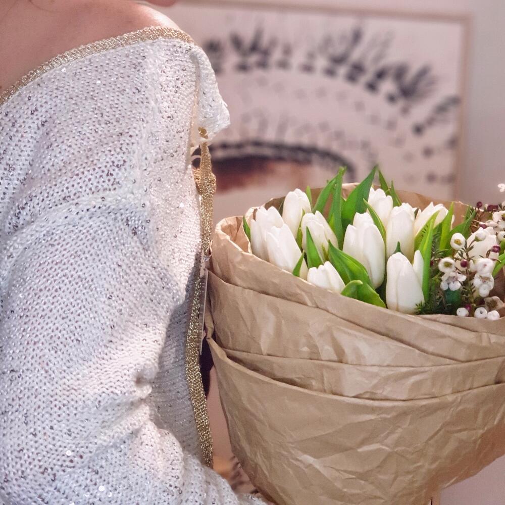 Лента атласная – 1 шт.Открыточка с вашими пожеланиями – 1 шт.Ваксфлауэр белый – 2 шт.тюльпаны белые – 15 шт.любовь флориста (бесплатно) – 1 шт.крафт жатая бумага – 1 шт.